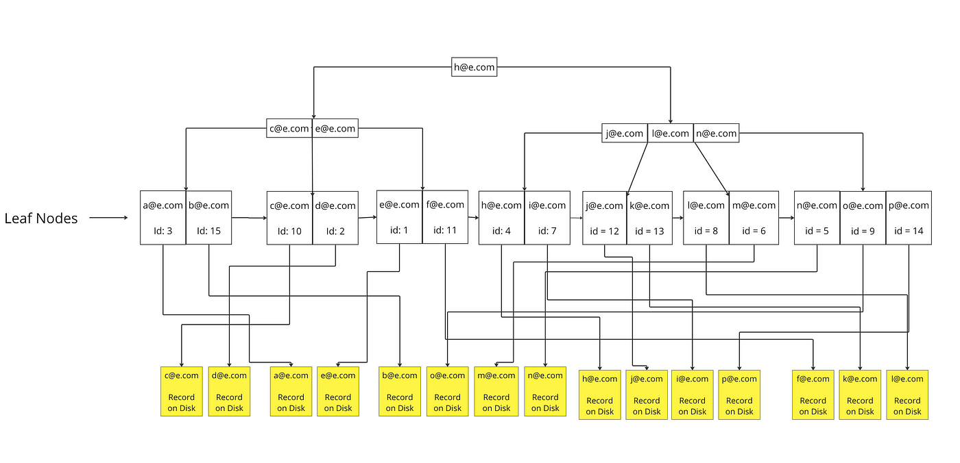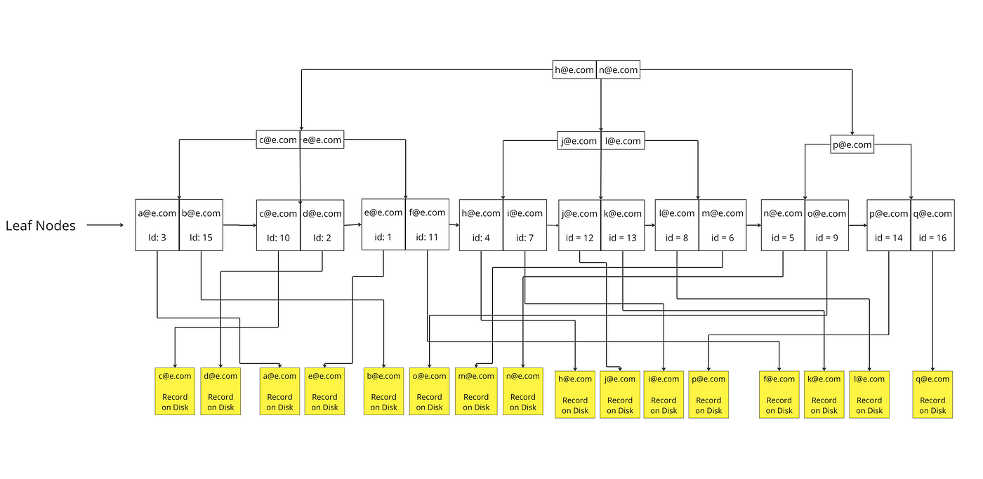 그림 3은 이메일을 키로 사용하는 B+ 트리를 나타냅니다.
