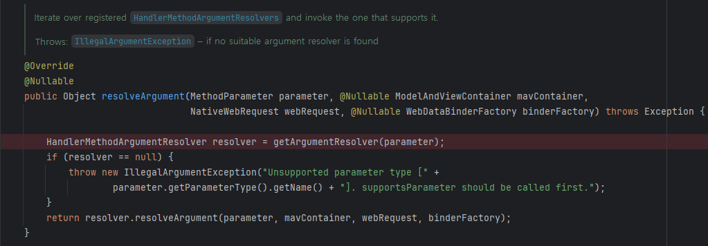 getArgumentResolver 메서드는 파라미터를 처리하는 HandlerMethodArgumentResolver 클래스들을 순회한다.
