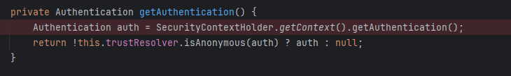 이 방식에서 Authentication 객체를 어떻게 가져오는지 디버깅 모드로 추적해보았다.
