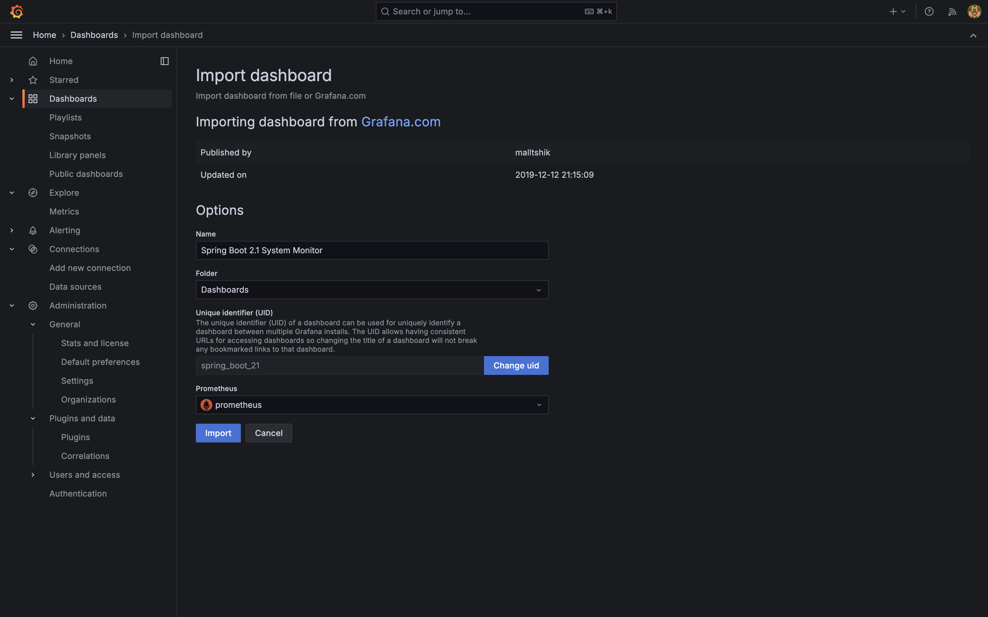 다시 Grafana 페이지로 돌아와서, Dashboard Import를 클릭한 후 복사한 Id를 입력하면 Dashboard를 Import 할 수 있다.