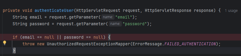4번에서 email, password가 null이어서 인증할 수 없다는 Exception이 발생한 것이다.
