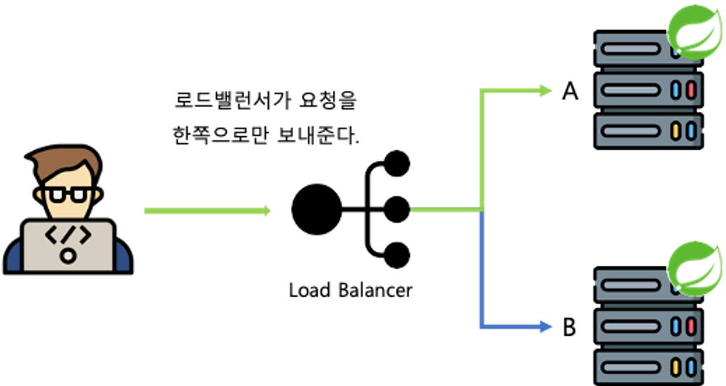Scale-Out 환경에서 세션 유지를 위한 한 방법은 Sticky Session이다. 이는 사용자의 모든 요청을 처음 연결된 서버에 고정시키는 방식으로, 세션 정보가 해당 서버에만 유지된다. 하지만 이 방식은 서버 간 요청이 불균등하게 분산될 수 있어 일부 서버에 과부하가 걸릴 수 있다.