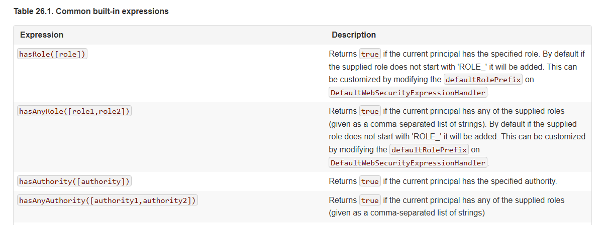 Spring Security 문서 26. Expression-Based Access Control (spring.io) << 여기를 들어가서 hasRole과 hasAnyAuthority 함수 동작의 차이를 찾아보았다.