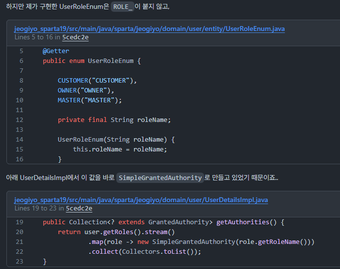하지만 UserRoleEnum 에서는 ROLE_을 붙이고 있지 않고, 이를 UserDetailsImpl.getAuthorities()에서 SimpleGrantedAuthority로 만들었기 때문에,