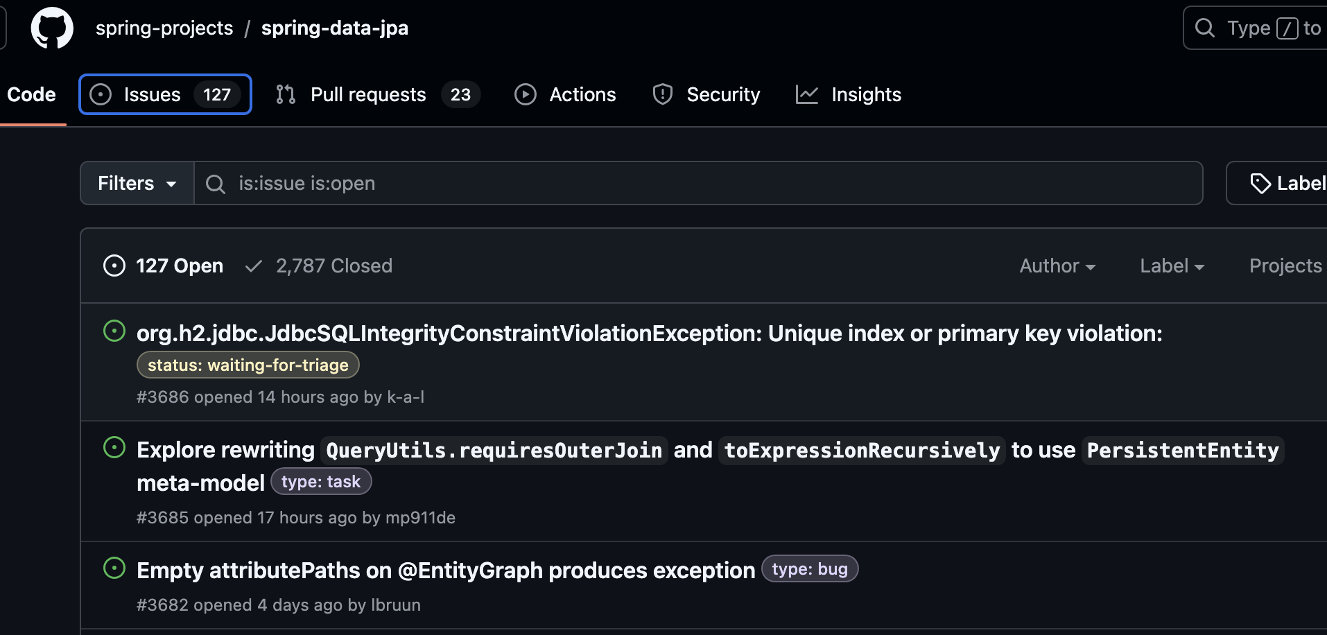 2024.11.24 기준 Spring Data JPA repo에 Issue들입니다.