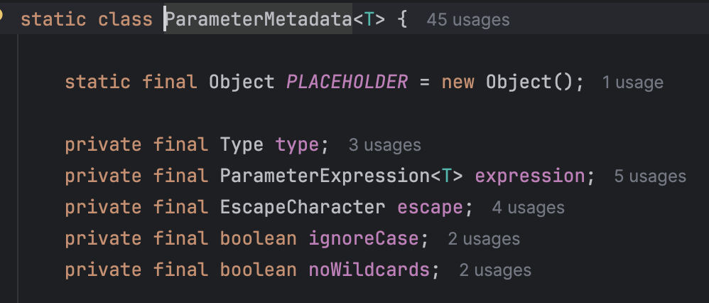 이 클래스에는 값의 타입 (type)이 null 인지를 판별하는 isIsNullParameter() 메서드가 구현되어 있고, ParameterMetadataProvider(provider)에 의해 제공됩니다.