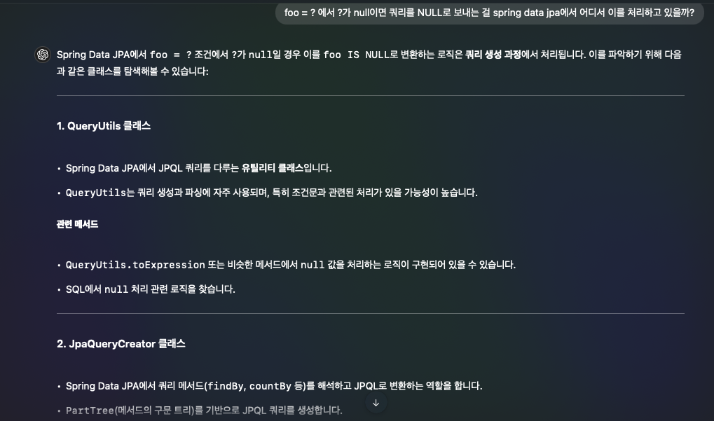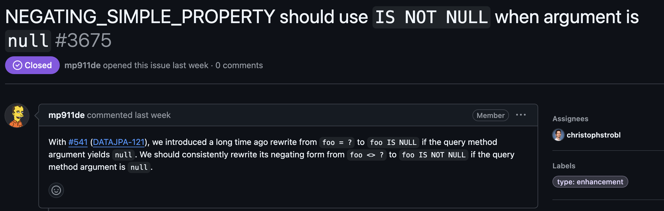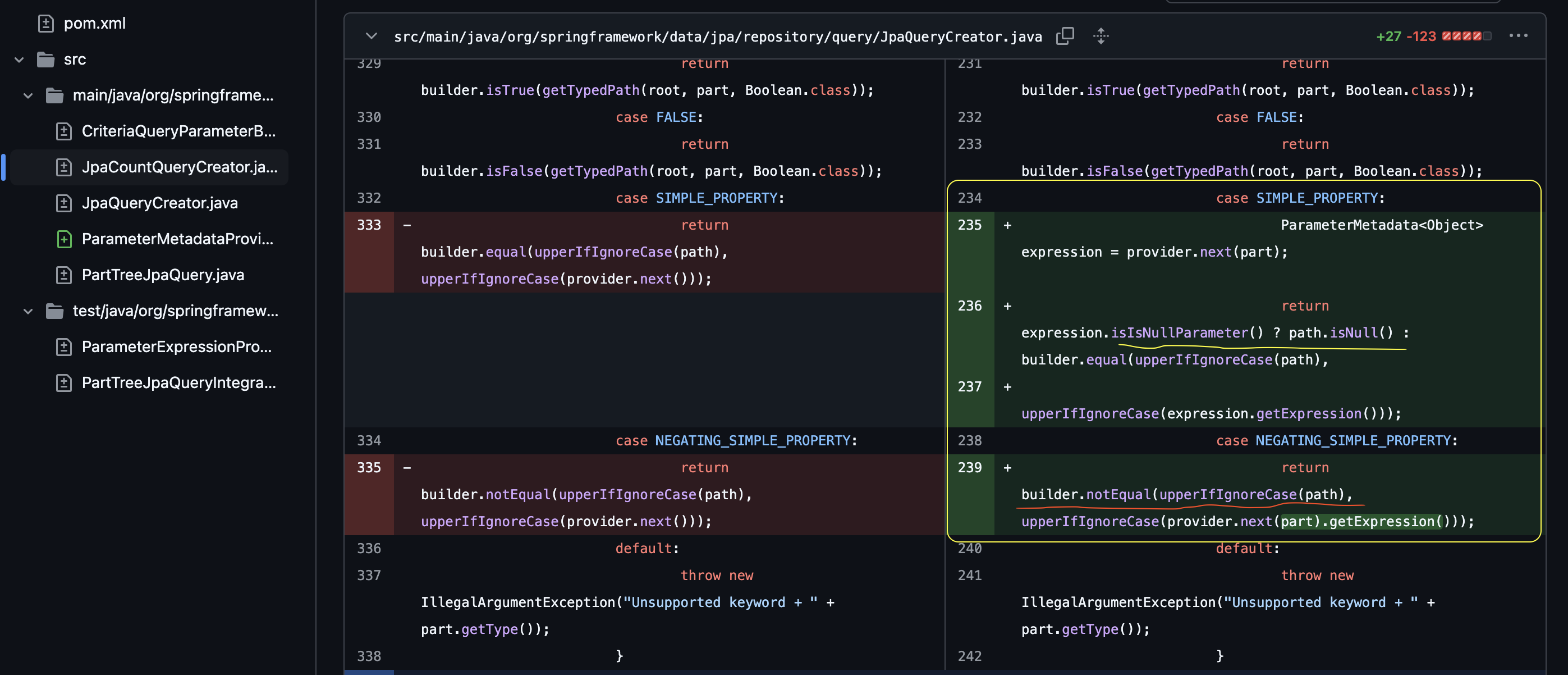 - Spring Data JPA는 기존에 foo = ? 조건에서 쿼리 메서드의 인자가 null일 경우 이를 foo IS NULL로 자동 변환하는 기능을 제공했음 (#541에서 도입).