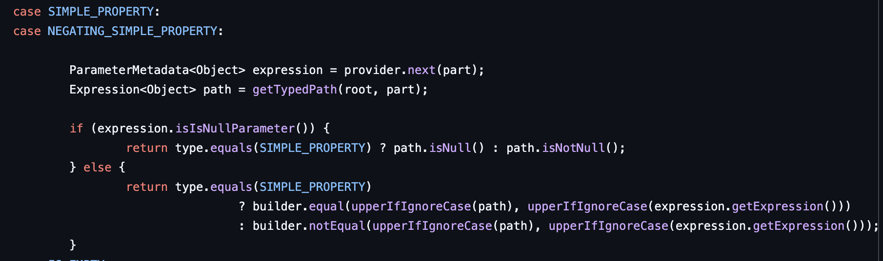 그런데 자세히 보니, SIMPLE_PROPERTY 부분에는 isIsNullParameter()의 참, 거짓 여부에 따라 isNull()을 하거나, builder.equal()이란 걸로 값을 return 하고 있습니다.