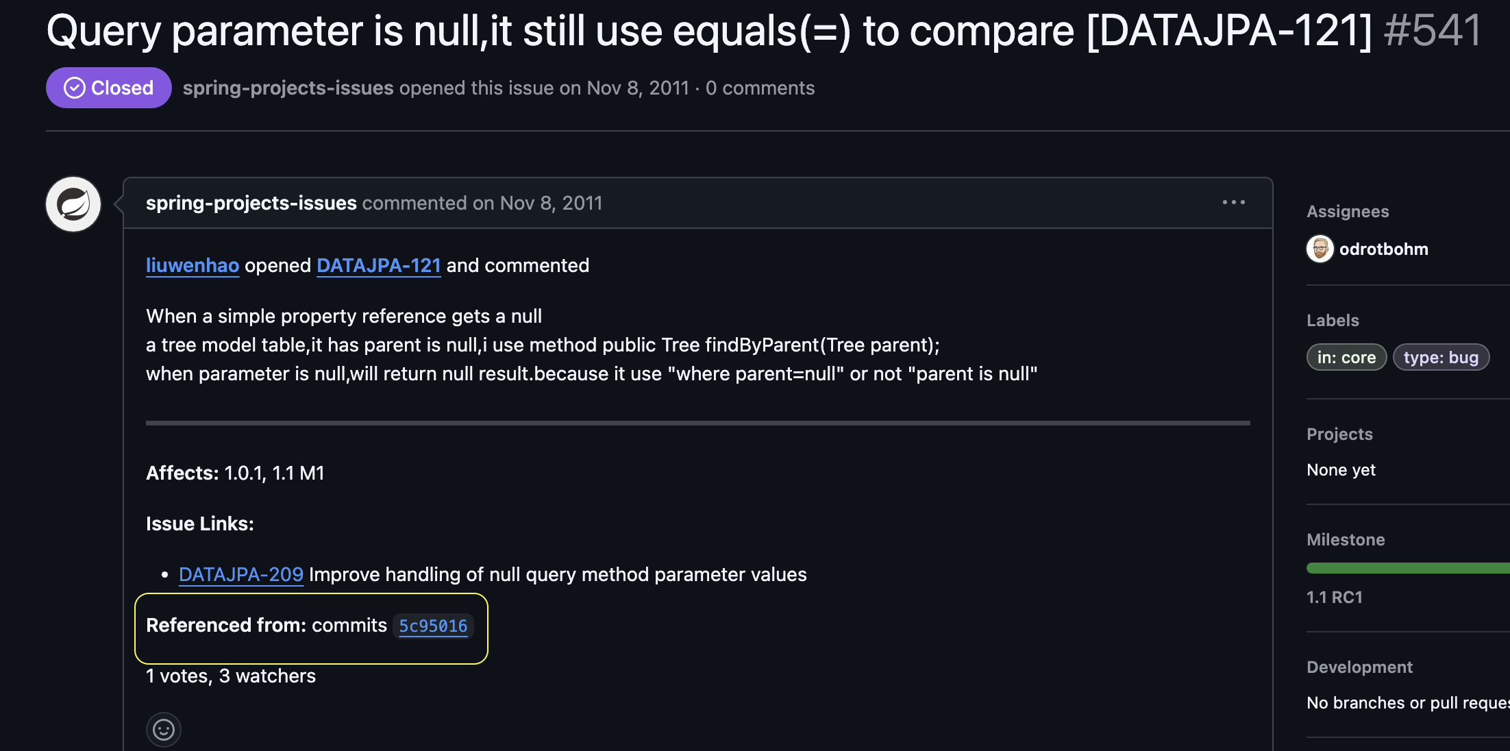 아마 Issue 내용에서 "Spring Data JPA는 기존에 foo = ?조건에서 쿼리 메서드의 인자가 null일 경우 이를 foo IS NULL로 자동 변환하는 기능을 제공했음 (#541에서 도입)"를 처리해 준 것 같습니다.