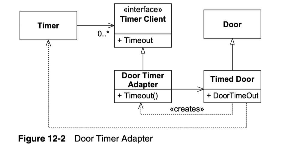 이 해결책은 ISP를 준수하며 Door 클라이언트가 Timer와 결합되지 않도록 합니다. 앞서 설명한 코드에서 Timer의 변경이 이루어진다고 해도 Door 사용자 중 아무도 영향을 받지 않을 것입니다. 게다가 TimedDoor는 TimerClient의 인터페이스를 가져야 할 필요가 없습니다. DoorTimerAdapter는 TimerClient 인터페이스를 TimedDoor 인터페이스로 변환할 수 있습니다.