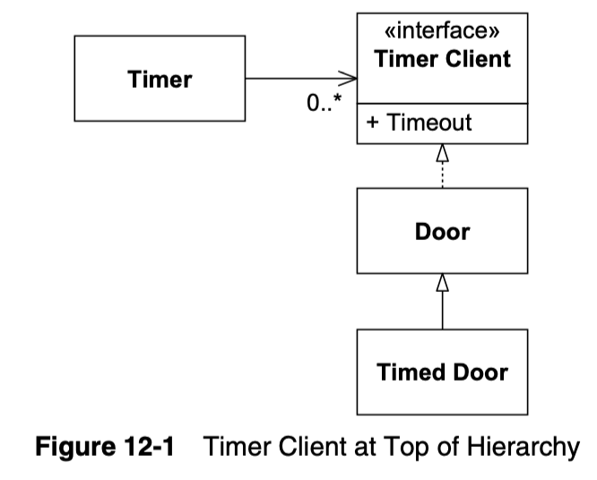 그러나 위 코드의 설계는 Door 및 Door 파생 클래스의 모든 클라이언트가 이 수정에 영향을 받게 만듭니다. 이것은 강직성(Rigidity)과 점도성(Viscosity)의 흔적이 있습니다. 타이밍이 필요하지 않은 Door 파생 클래스의 클라이언트에게 TimerClient의 버그가 어떤 영향을 미쳐야 하는 이유가 있을까요?