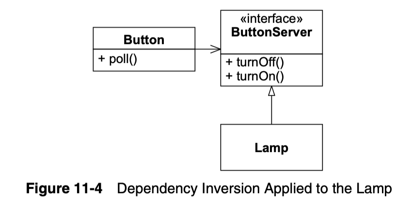 Lamp는 ButtonServer에 의존하지만 ButtonServer는 Button에 의존하지 않습니다. ButtonServer 인터페이스를 조작하는 방법을 알고 있는 모든 종류의 객체는 Lamp를 제어할 수 있을 것입니다. 따라서 이는 Lamp가 ButtonServer 인터페이스만 의존한다기엔 모호합니다.