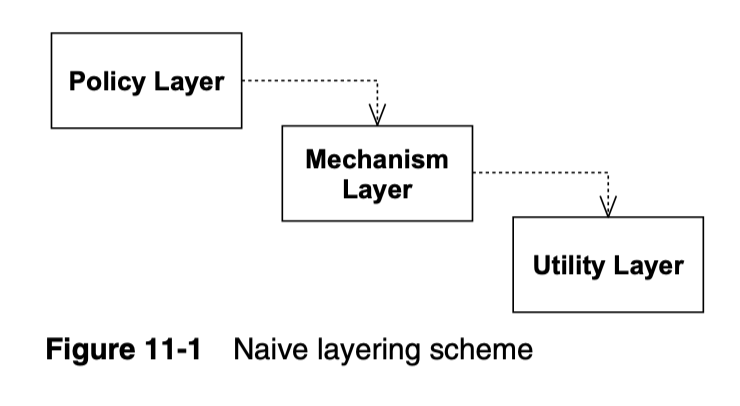 Figure 11-1의 다이어그램에서 고수준 Policy 계층이 하위 수준 Mechanism 계층을 사용하고, Mechanism 계층이 다시 상세 수준 Utility 계층을 사용하는 것으로 보입니다.